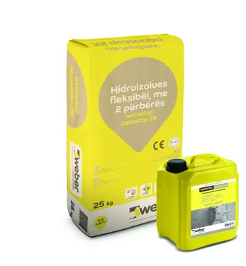 webertec Aquastop 2K eshte hidroizolues me 2 komponentë, me bazë çimento dhe i modifikuar me polimerë. Ka në përbërje 25kg pluhur me bazë çimento të përforcuar me aditive dhe 8kg polimerë të lëngshëm. webertec Aquastop 2K përdoret për hidroizolim në ambiente të brendshme dhe të jashtme. Mbron bazamentet e betonit, çimentos, tullave dhe blloqeve nga lagështira. webertec Aquastop 2K është bazamenti i duhur për instalimin e sigurtë të pllakave në zona të ndikuara vazhdimisht nga uji, si ballkonet, tualetet dhe kuzhinat.