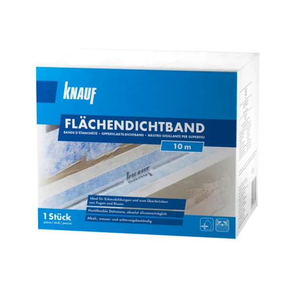 Knauf Flächendichtband është një bandë elastike hidroizoluese e projektuar për abdiktimin e lidhjeve në mure dhe dysheme, duke siguruar një mbyllje të qëndrueshme dhe të papërshkueshme nga uji në zonat kritike të ndërtimit.